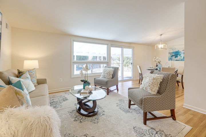 Enter into the light-filled and newly renovated foyer and ascend the stairs to the spacious living and dining area with vaulted ceilings and freshly refinished hardwood floors.