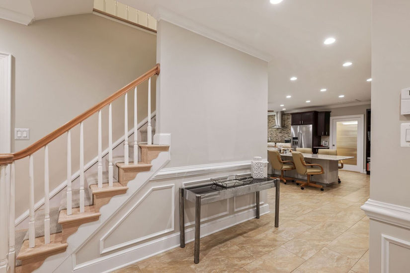 The dining room is open to the kitchen and includes beautiful built-ins as well. There is an additional formal living room on this level that opens up to an informal office space and the entrance to the elevator. A commercial-grade elevator was added to the home in 2016 and serves all three levels. In the rear of the main level is a sunroom overlooking the private yard space with large pool and expansive composite deck perfect for entertaining.